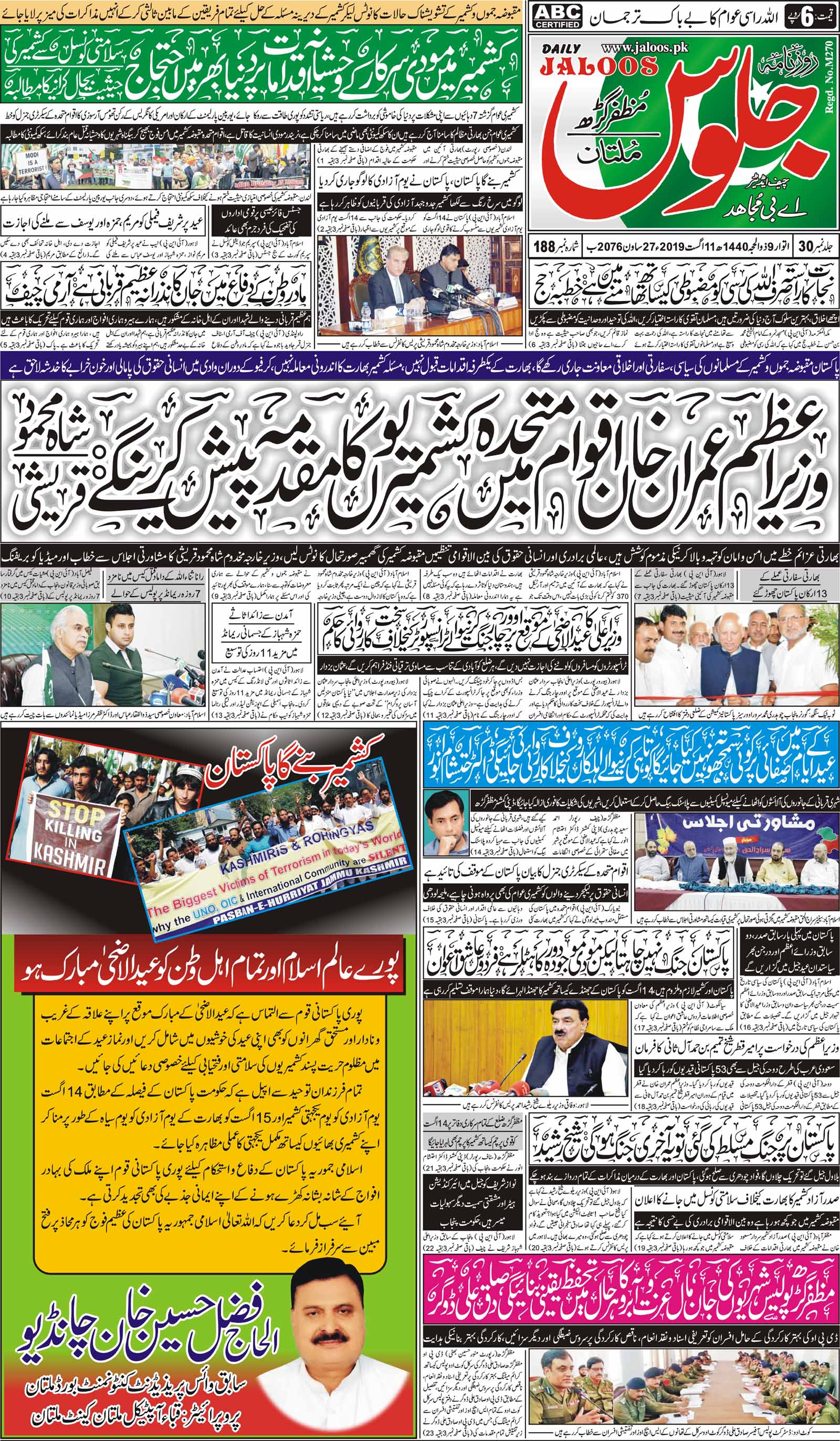 روز نامہ جلوس اتوار 11 اگست 2019ء صفحہ اول