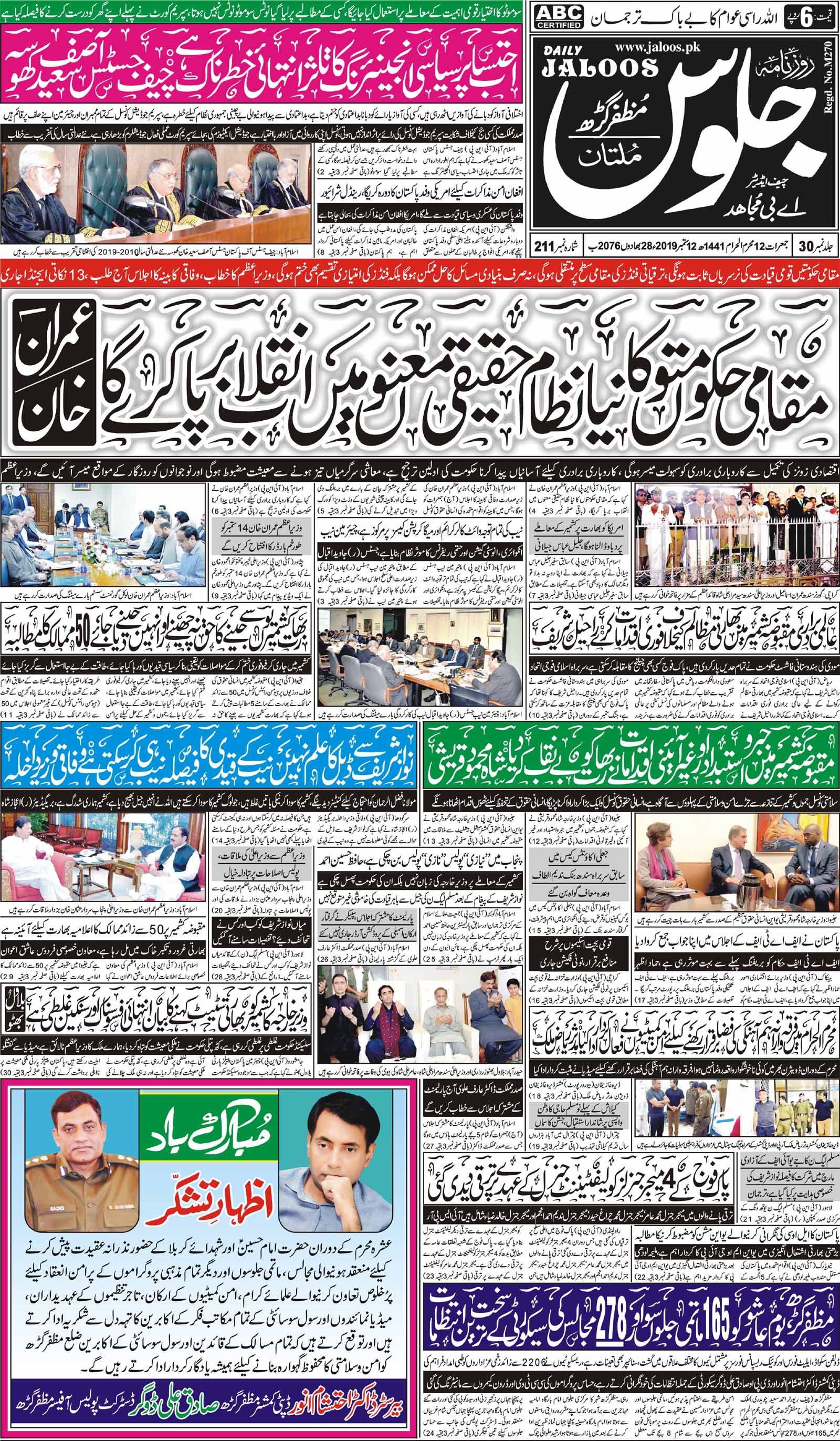 روز نامہ جلوس جمعرات 12 ستمبر 2019ء صفحہ اول